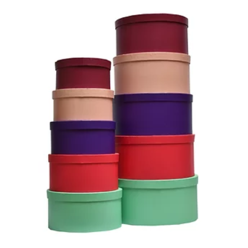 Cajas boutique circulares en colores vivos de cartón grueso, con un estilo diferente.