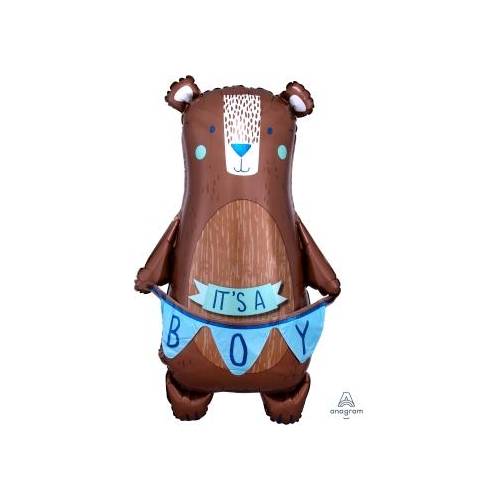 Globo con la forma de un oso sujetando unos banderines estampados con el mensaje "It's a Boy". Perfecto para decorar fiestas de baby shower o para regalar en un nacimiento. Fabricado en foil con medidas de 50 x 86 cm.