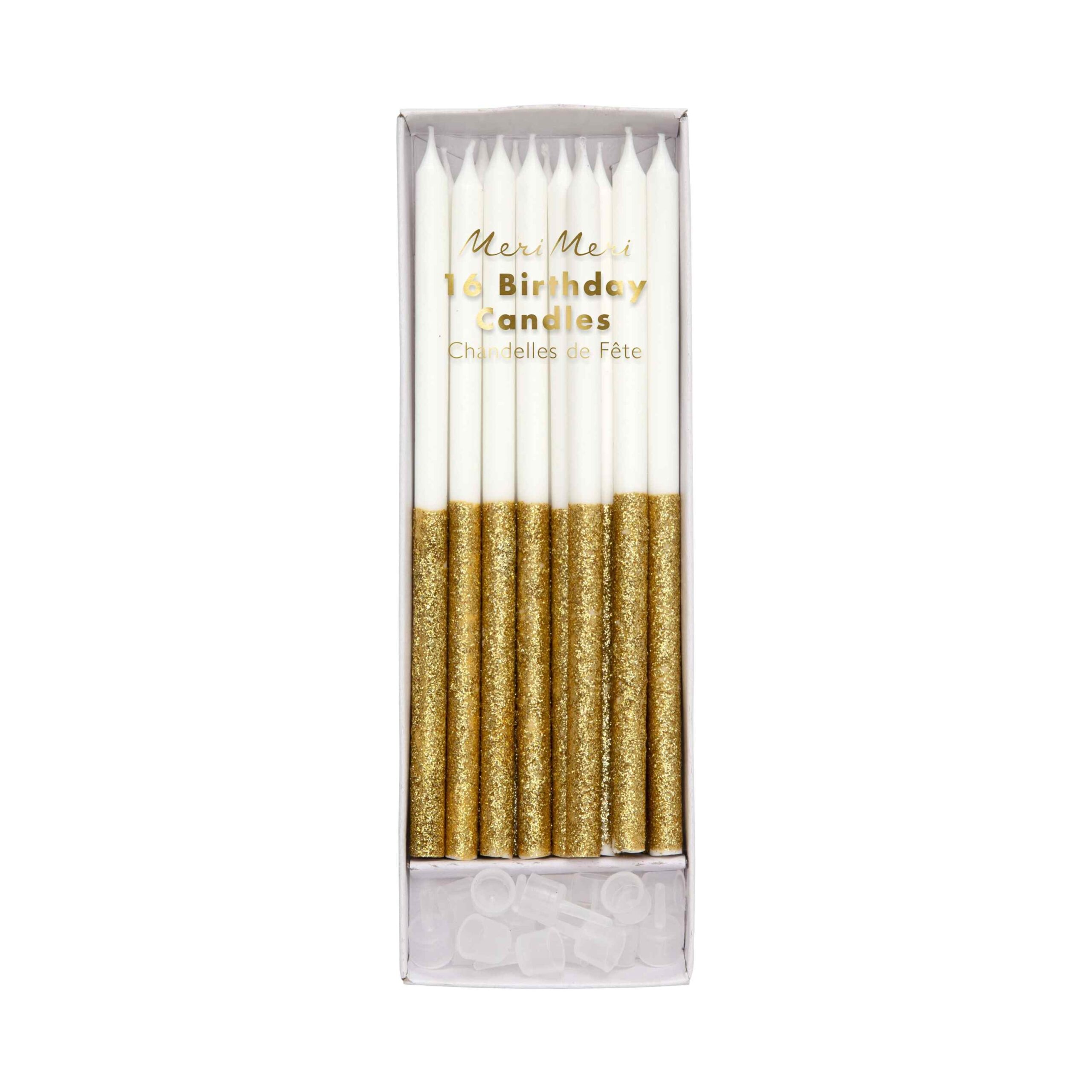 Es realmente una fiesta si no empujamos al cumpleañero al pastel y soplamos las velas? Agrega un toque único de color a tu pastel con este set padrísimo de 24 velas blancas con un toque de diamantina dorada.