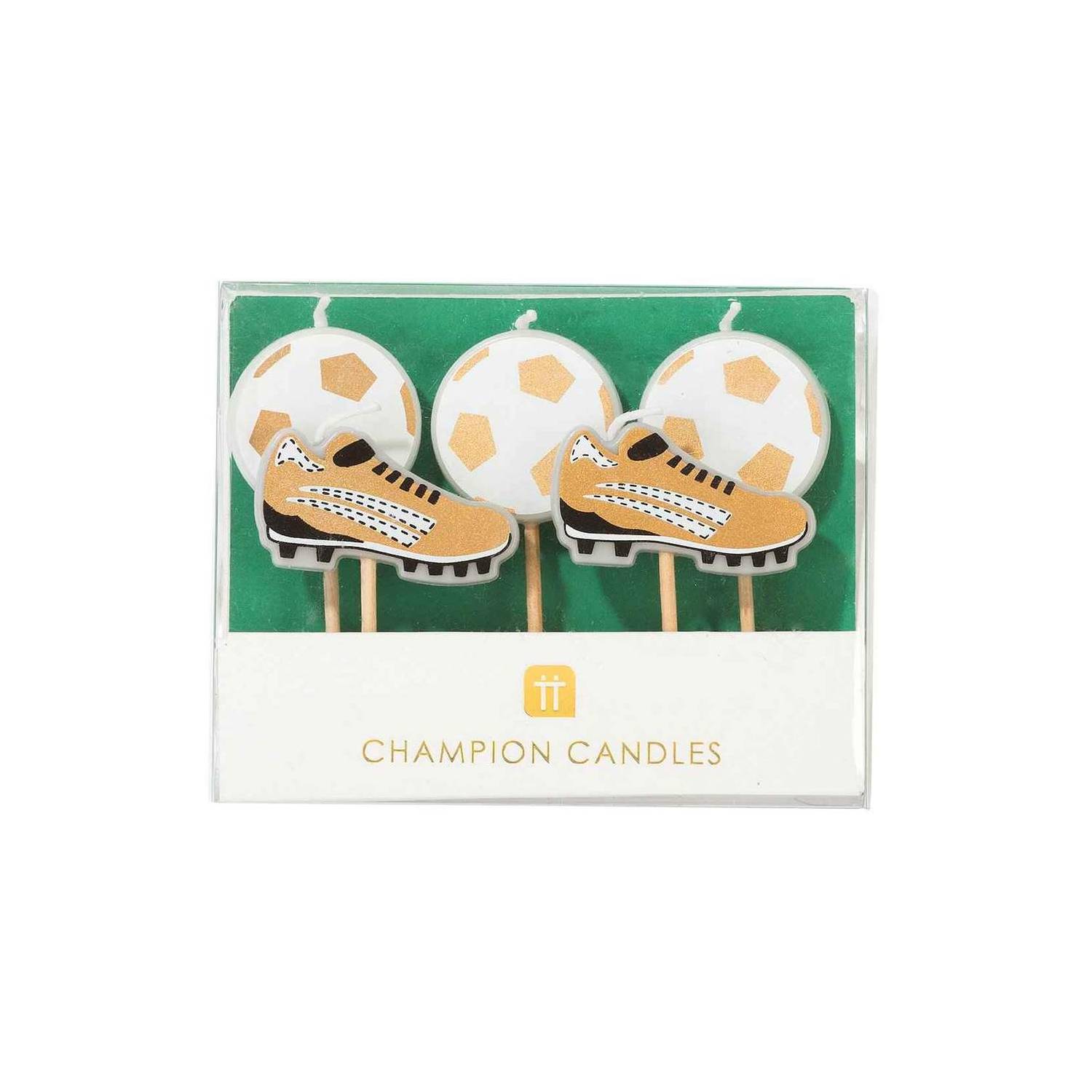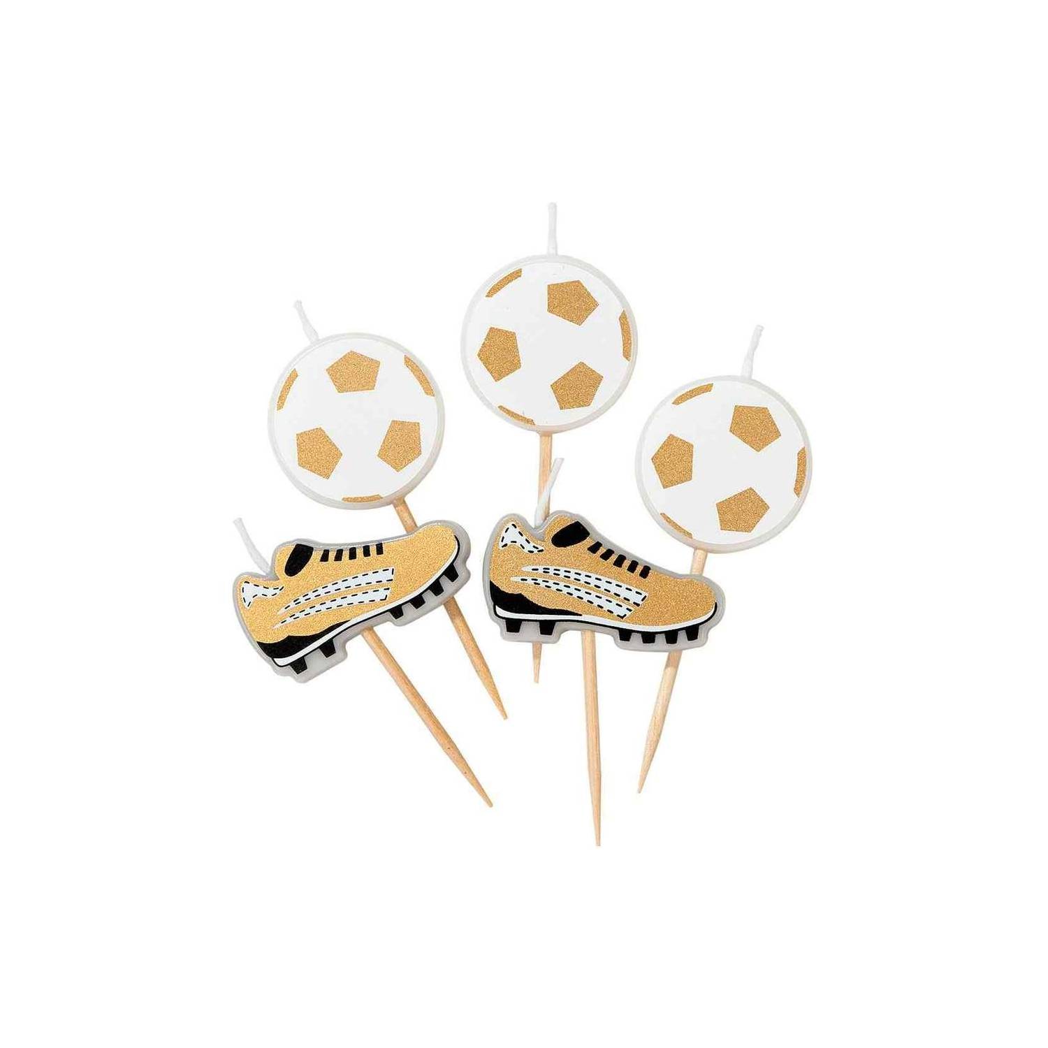 Cada paquete contiene 5 velas - 3 de balones y 2 de tacos de futbol.